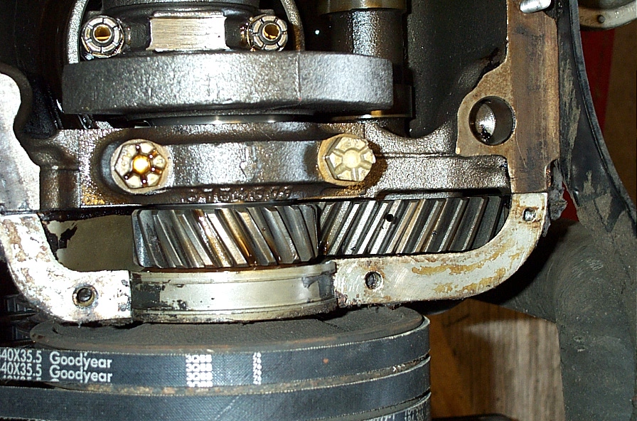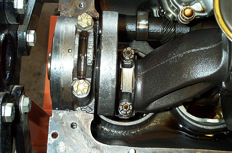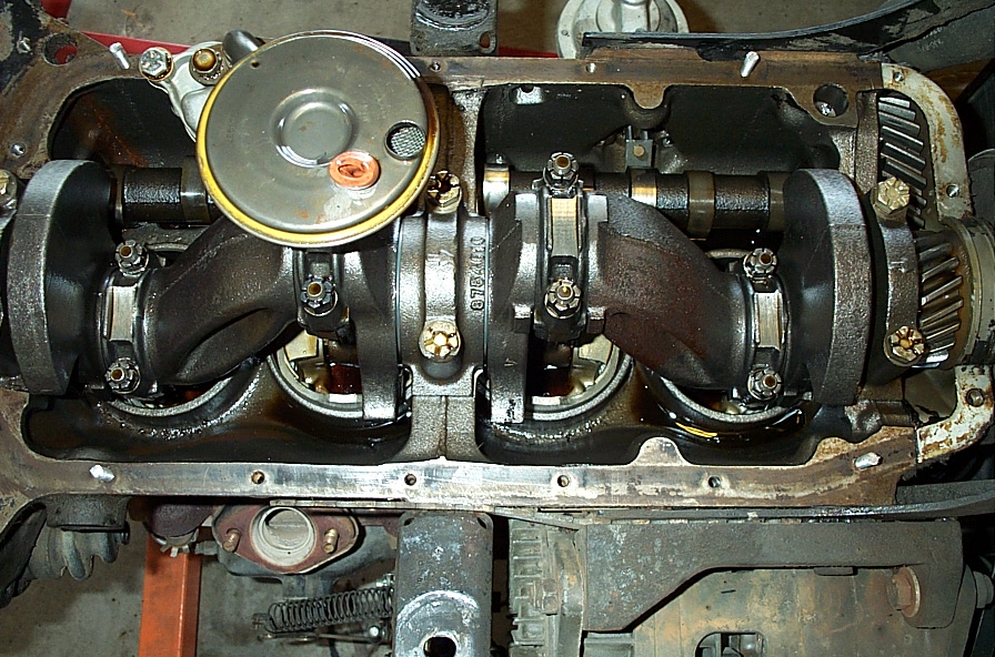 A shot of the whole lower half of the engine. Crankshaft, oil sump and pump, timing gears, main bearing caps