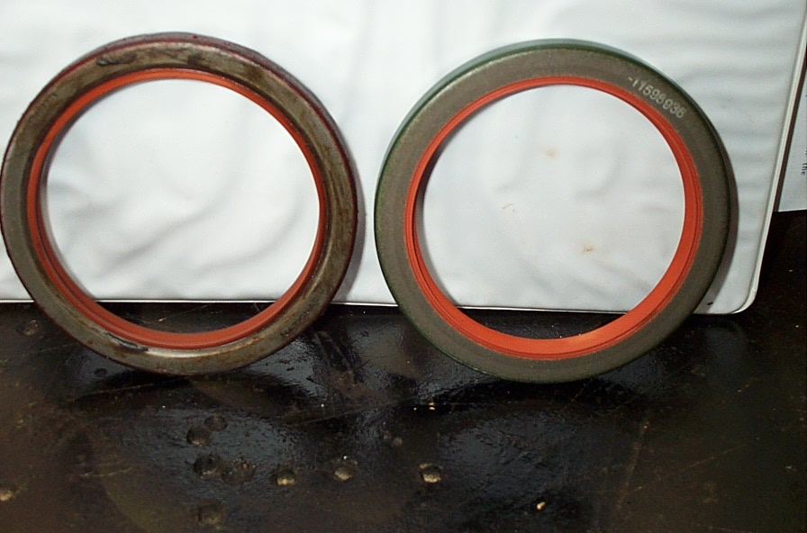 Rear main seal. Old on the left. The old seal had small cuts in it, don't know how that happened